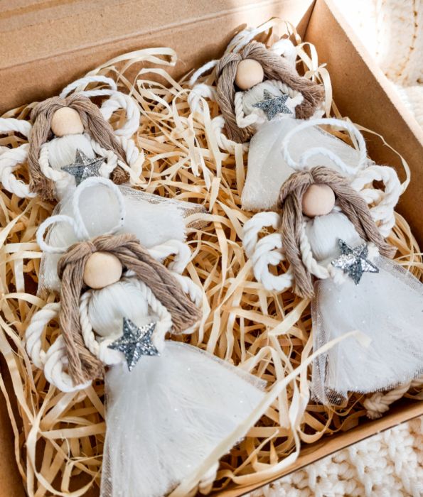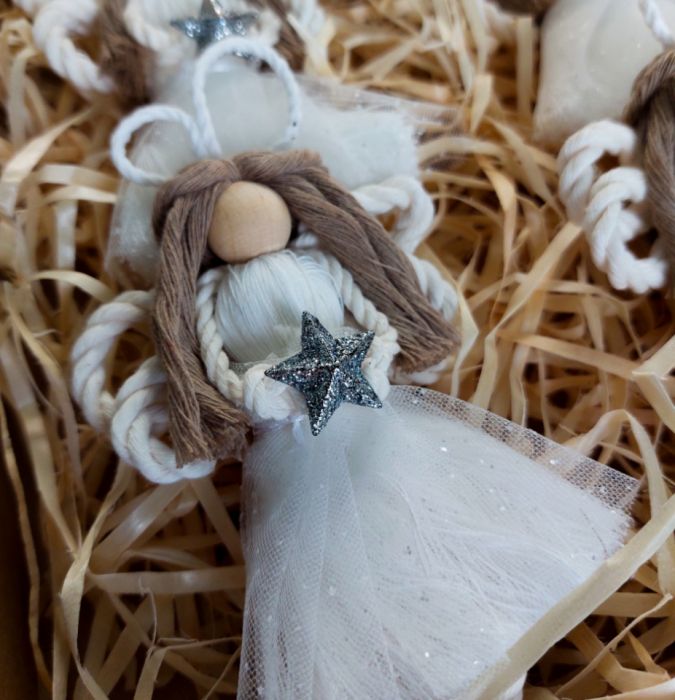 Komplet 4 aniołków choinkowych z zawieszką, wykonanych ręcznie z makramowego sznurka. Każdy z aniołków posiada sznurek, umożliwiający powieszenie go na choince. Aniołki "ubrane" w sukienki z białego, brokatowego tiulu, posiadają skrzydełka z grubego sznurka oraz krótkie, zwisające nóżki. Aniołki w komplecie z pudełkiem i wypełnieniem, dzięki czemu otrzymujemy samodzielny, niezwykle oryginalny prezent, którego nie znajdziemy galerii handlowej lub innym sklepie :) Istnieje możliwość dopięcia karteczki lub bileciku do wyspiania życzeń.