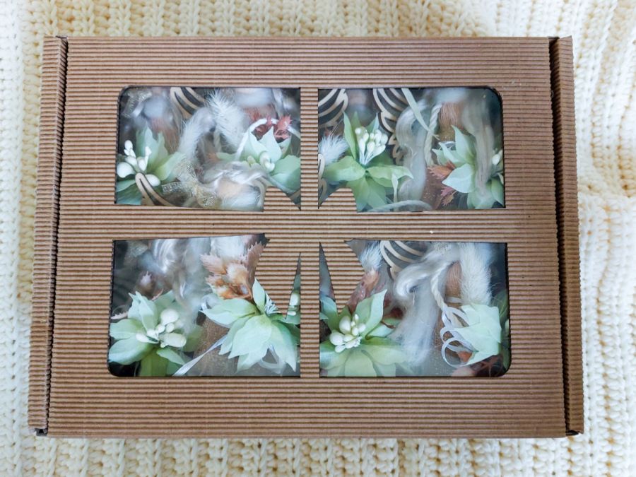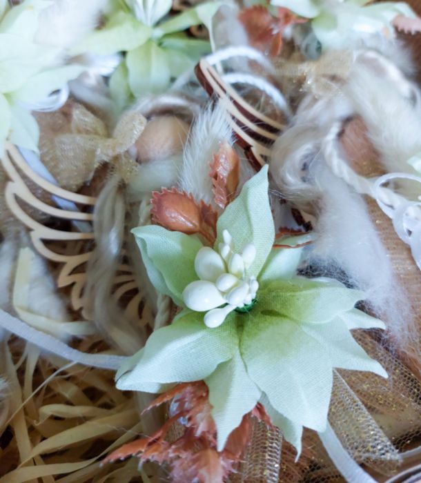 Komplet 8 ręcznie wykonanych aniołków z makramowego sznurka do powieszenia na choince. Aniołki ubrane są w sukienki ze złotego, brokatowego tiulu, posiadają mini bukieciki z zieloną poinsecją z bawełny, rękawiczki oraz buciki z wełny. Mają długie, kręcone blond włosy oraz ażurowe skrzydełka ze sklejki. Aniołki zapakowane w świąteczne pudełko z wypełnieniem w środku, dzięki czemu idealnie nadają się na prezent, którego nikt nie powieli bo jest wykonany w 100 % ręcznie ;)