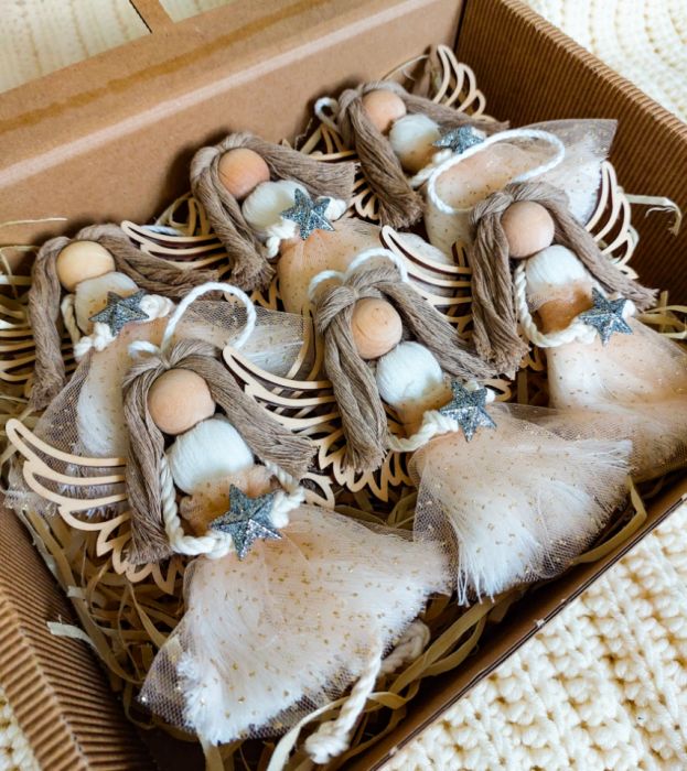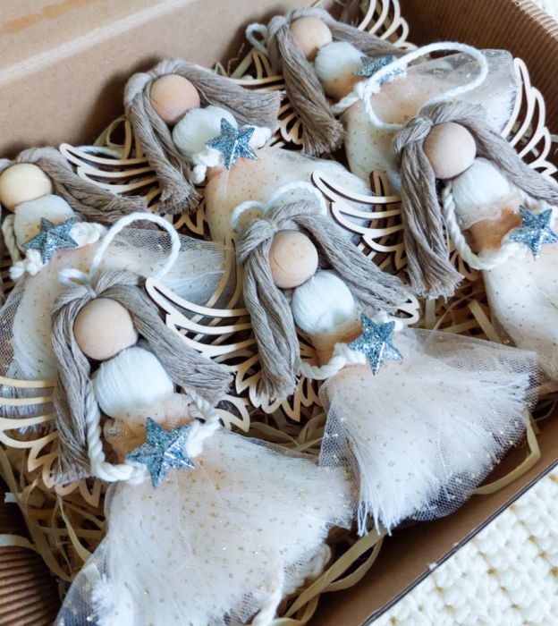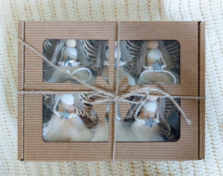 Komplet 6 ręcznie wykonanych aniołków z makramowego sznurka, z sukienkami z brokatowego tiulu. Każdy aniołek posiada sznurek - zawieszkę, dzięki czemu można go powiesić na choince. Dodatkowo aniołki posiadają ażurowe skrzydełka ze sklejki a w rączkach trzymają srebrną gwiazdkę. Aniołki stanowią komplet z pudełkiem ze świątecznym motywem i wypełnieniem w środku, dzięki czemu mamy oryginalny, samodzielny prezent. Istnieje możliwość dołączenia karteczki lub bileciku do wpisania życzeń.