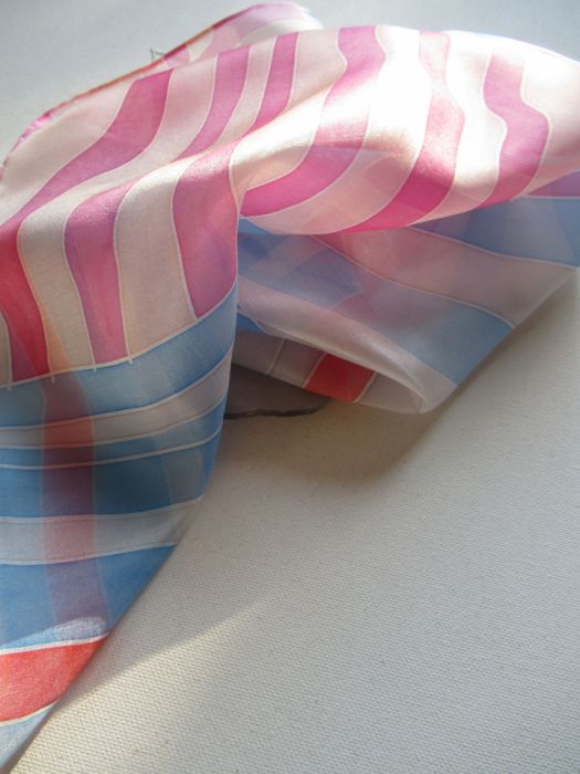 Elegancka i wyjątkowa apaszka z naturalnego jedwabiu ozdobiona geometryczną dekoracją. Chustka w odcieniach niebieskości, szarości, różu, moreli, która pięknie ozdobi Twoją stylizację. Można ją nosić na mniejsze i większe okazje. Pasuje do marynarki, sukni, bluzki.