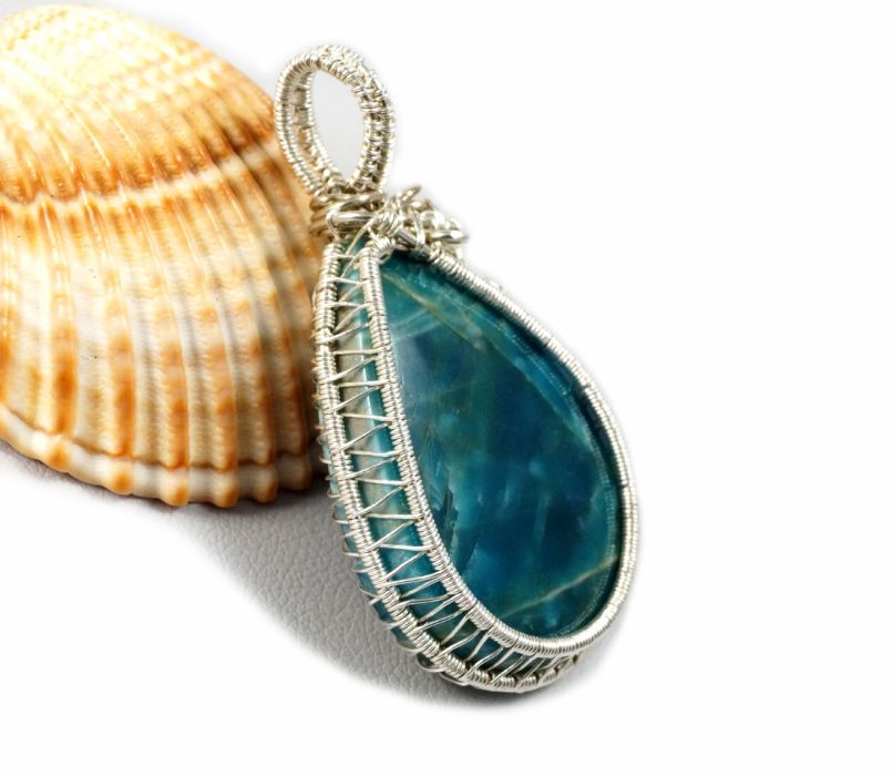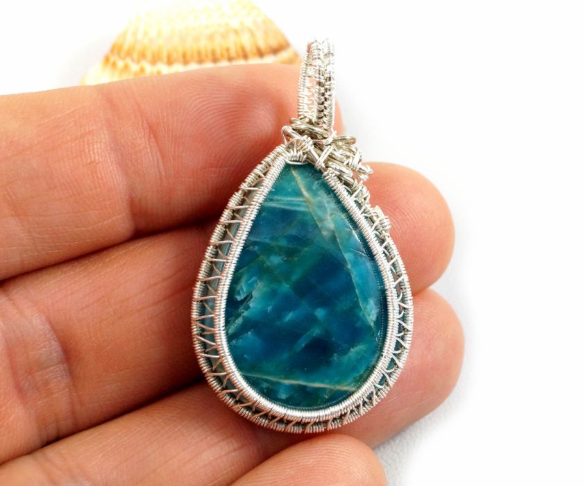 Bajeczny, misternie pleciony wisior z niebieskim kaboszonem apatytu.