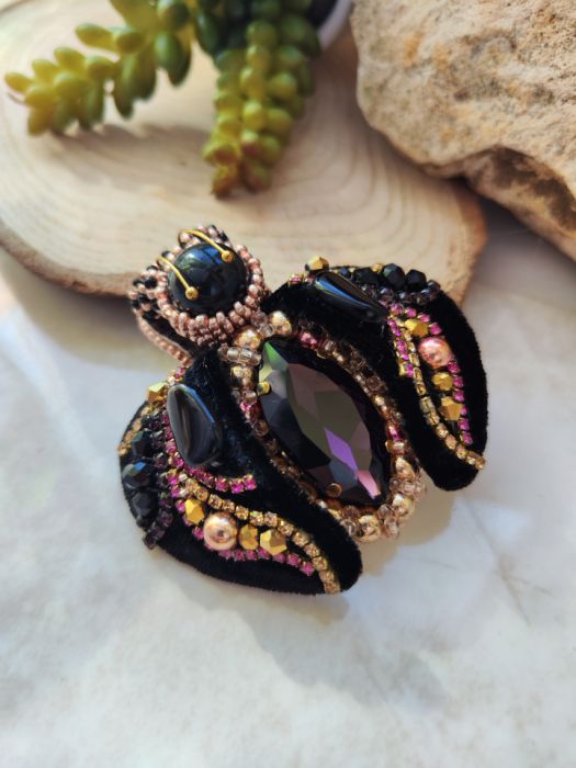 Zanurz się w świat wyjątkowego rękodzieła z tą ekskluzywną broszką w kształcie żuka. To małe dzieło sztuki powstało z połączenia wielu technik i najwyższej jakości materiałów, tworząc jedyną w swoim rodzaju, dopracowaną kompozycję.