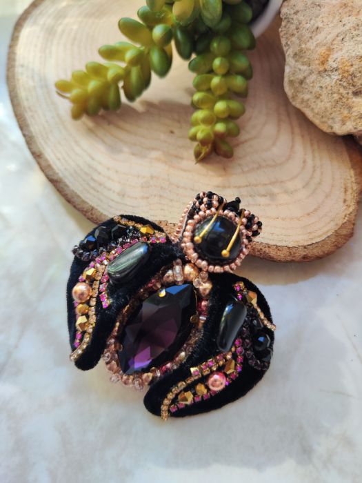 Stal, Tkanina, Akryl,Broszka została wykonana z miękkiego aksamitu i ozdobiona precyzyjnym haftem, czeskim koralikiem, kryształkami oraz lekkimi piórami, które nadają jej wyjątkowej lekkości i finezji. Tył broszki wykończony jest ekologiczną skórą, a solidne zapięcie gwarantuje wygodę i bezpieczeństwo noszenia.