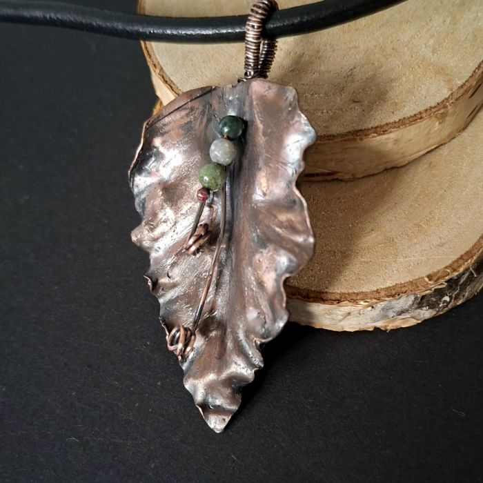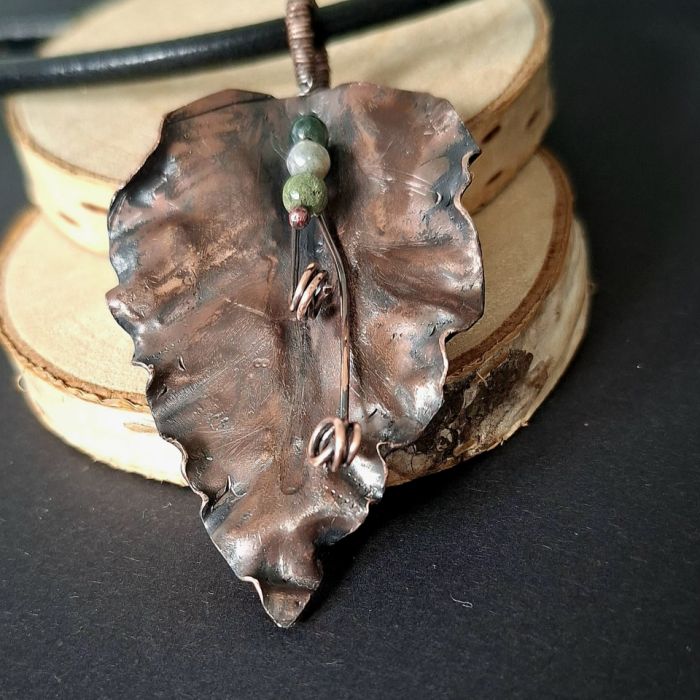 Wyjątkowy wisior w kształcie liścia. Ręcznie formowany z miedzi, ozdobiony małymi agatami mszystymi. Całość oksydowana i polerowana, by nadać charakteru.