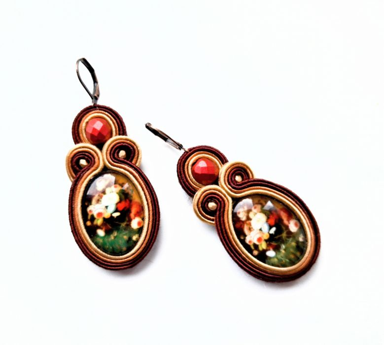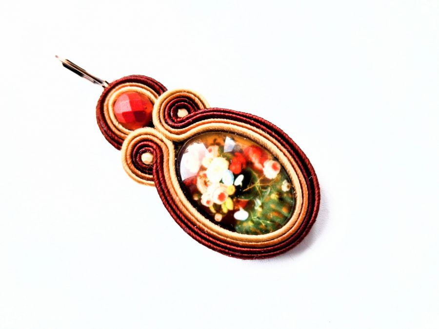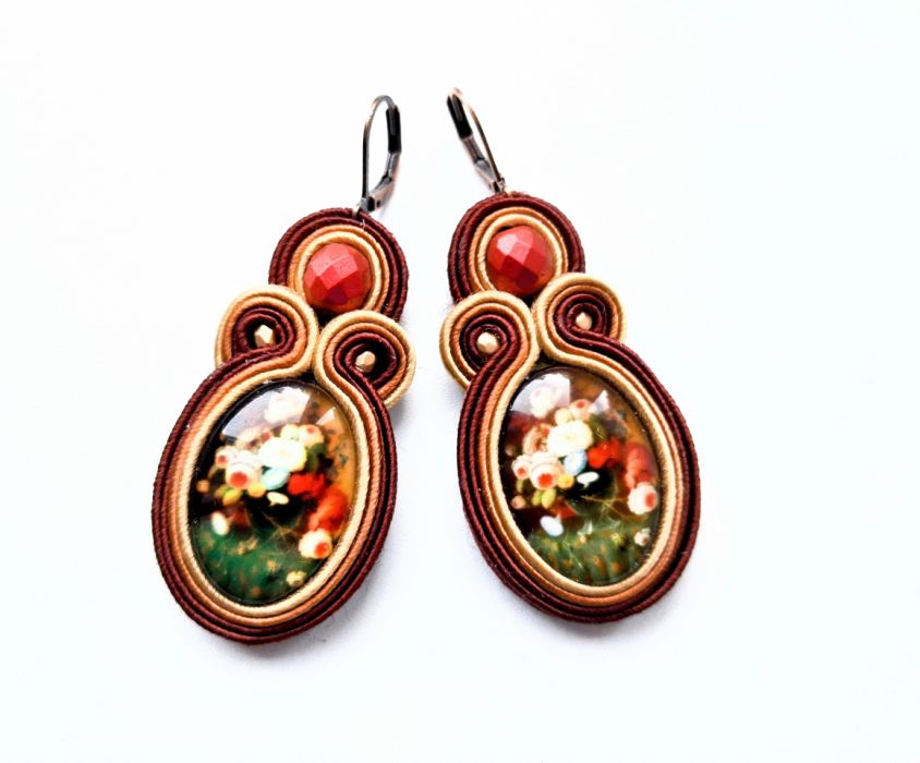 Kolczyki wykonane w modnej technice haftu sutaszowego. Jest ona pracochłonna, ale daje piękne efekty.