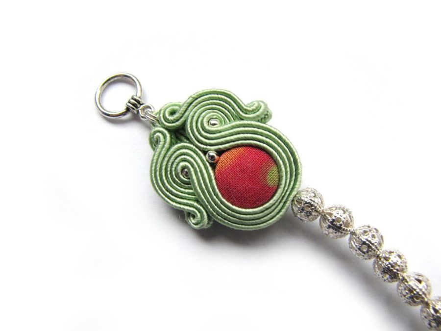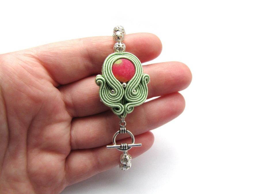 Wykonana z najlepszej jakości sznureczków sutasz, elementów posrebrzanych oraz kolorowego guzika. Element sutasz podklejony cienkim filcem, impregnowany - co zabezpiecza przed nadmiernym zabrudzeniem. To mój jedyny taki guziczek więc bransoletka jest jedyna w swoim rodzaju. Wymiary: długość całkowita - 17,5cm, element sutasz - 3,2cm/2,6cm. Polecam...