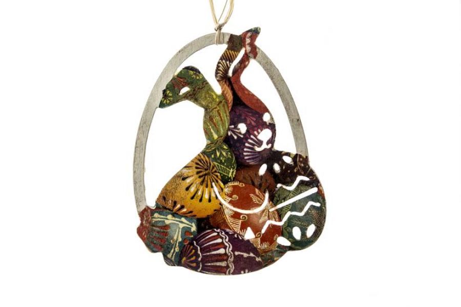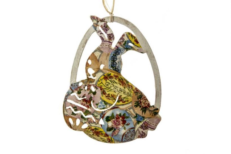 Ażurowa zawieszka w kształcie jaja, wykonana metodą decoupage z cieniutkiej drewnianej sklejki.