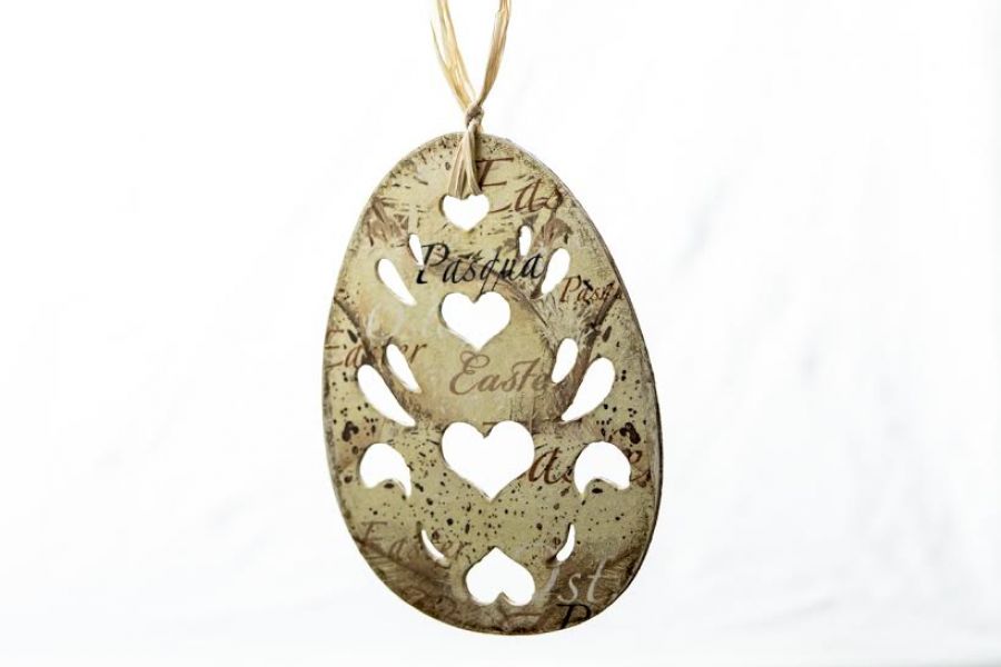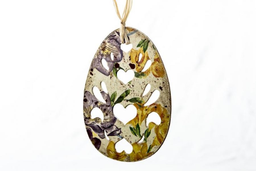 Ażurowa zawieszka w kształcie jaja, wykonana metodą decoupage z cieniutkiej drewnianej sklejki.