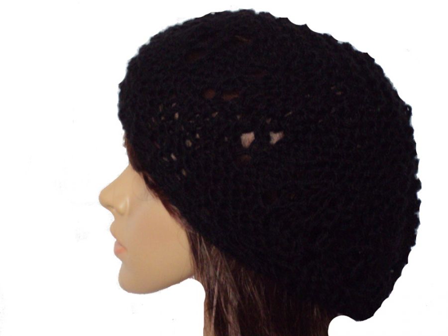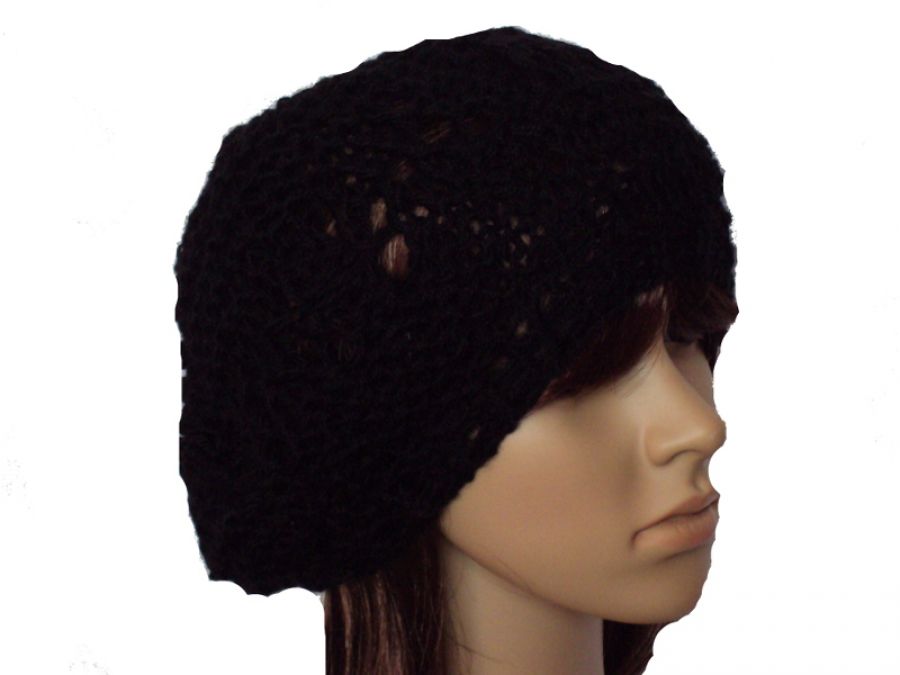 beret/czapka wydziergany z czarnej cienkiej włóczki akrylowej. może być ciekawym dodatkiem do wiosennego ubioru. polecam.