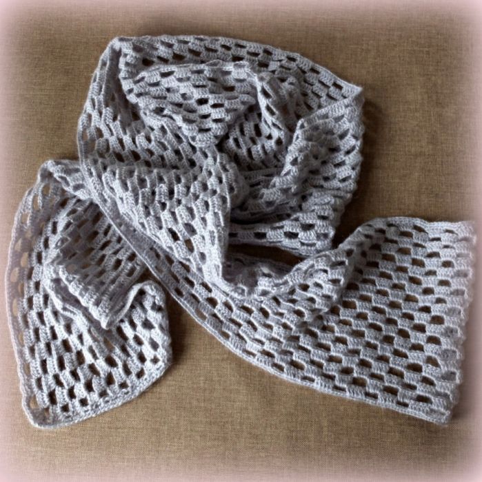 Szalik wykonany jest z włóczki moherowej, ściegiem ażurowym. Kolor szalika siwy.