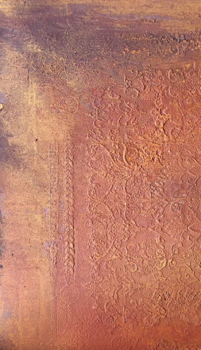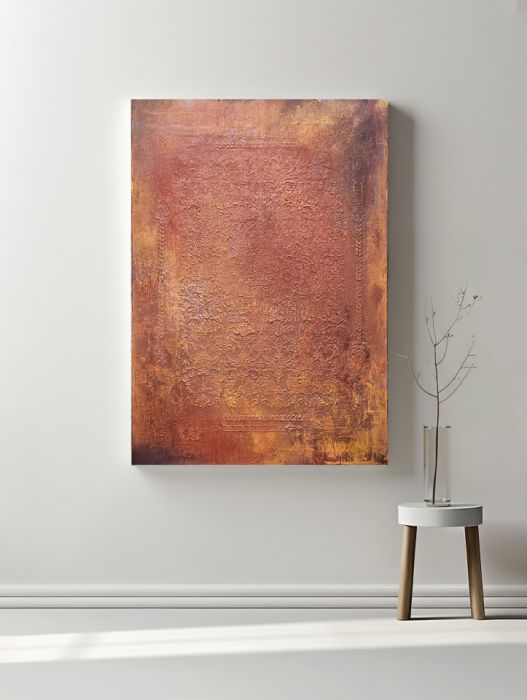 Mixed media na płótnie (100×140 cm): pasta strukturalna, naturalne pigmenty ziemne, akryl i medium akrylowe, zabezpieczone matowym werniksem.