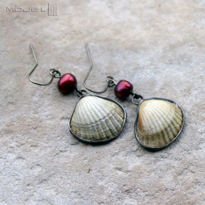 Kolczyki z prawdziwych bałtyckich muszelek i bordowych hodowlanych perełek. Muszelki oprawione są w miedź pokrytą cyną, patynowaną i lekko przetartą. Zawieszone są na metalowym biglu w kolorze grafitowym. Kolczyki są leciutkie, a bałtyckie muszelki są kruche, więc trzeba się obchodzić z nimi ostrożnie :)
