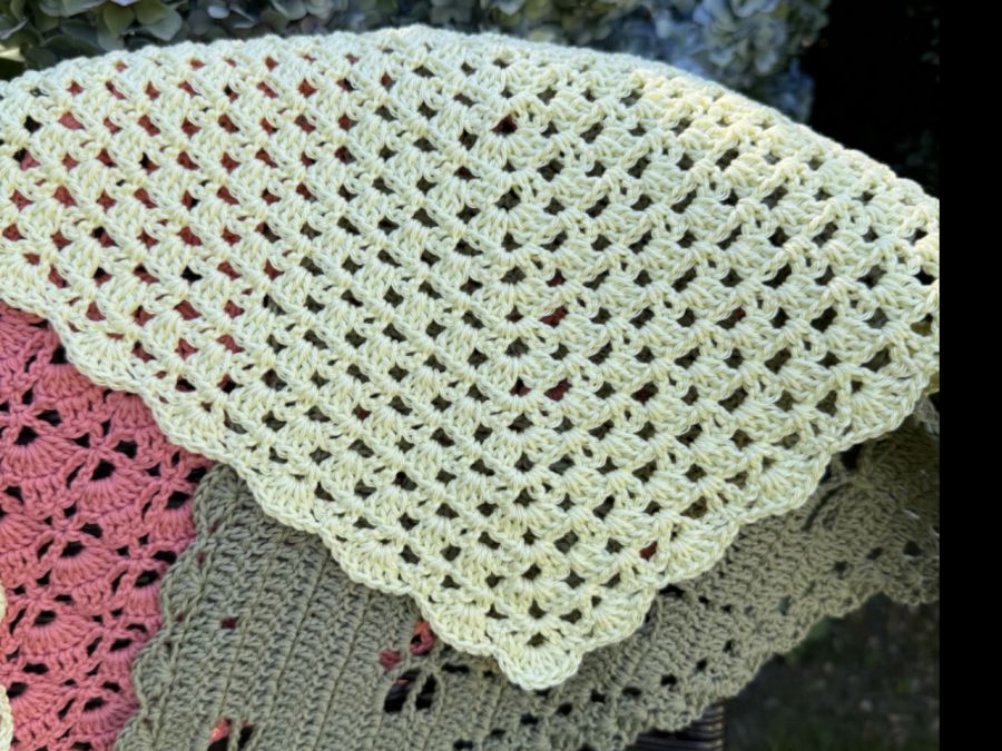 Małe chustki wykonane ręcznie szydełkiem, fajne nakrycie głowy. Zrobione są z bawełny 100% w różnych kolorach: zielonym, koralowym, żółtym i różowym. Mogę wykonać w innym kolorze. Cena dotyczy jednej sztuki. Wymiary ; najdłuższy bok 50-54cm , wysokość trójkąta 25-28cm