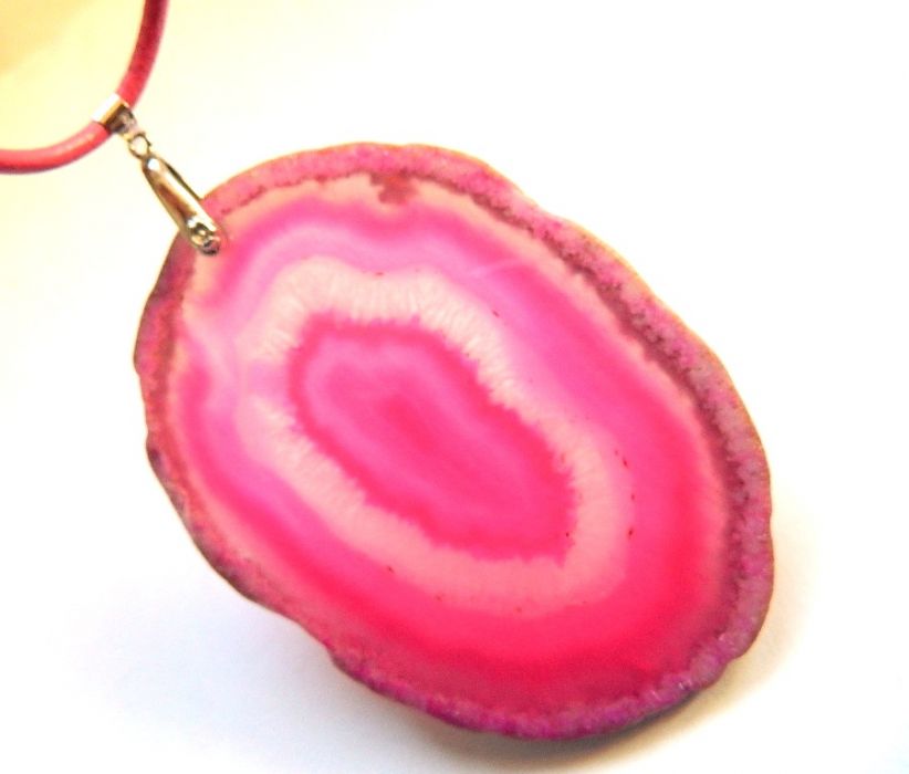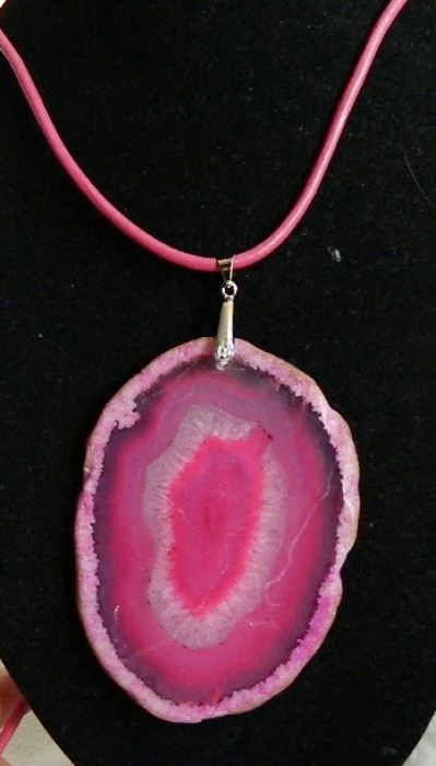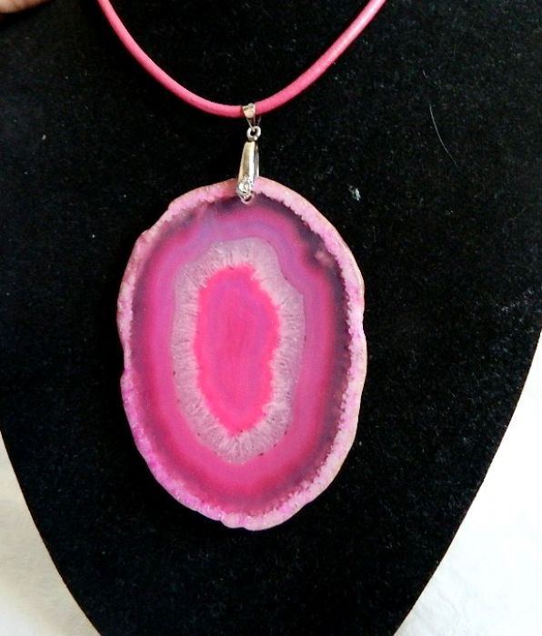 Wyjątkowo duży, efektowny kamień w pięknym różowym kolorze. Surowa, nieregularna ramka z inkluzjami, a następnie kolejne warstwy agatu i kryształu.