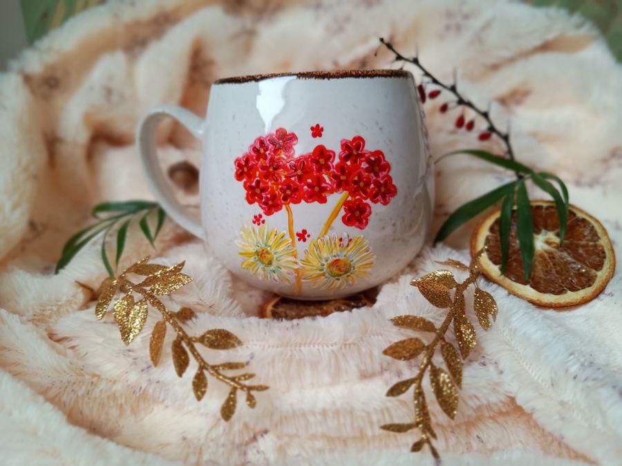 Duży kubek z kwiatami zachęcającymi do odpoczynku, chwilowego zatrzymania, relaksu. Kubek baryłka malowany wiele godzin z wielką troską o wszelkie szczegóły z miłości do natury, z miłości do tego co piękne i ulotne..
