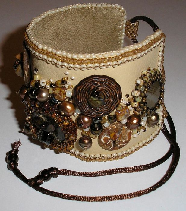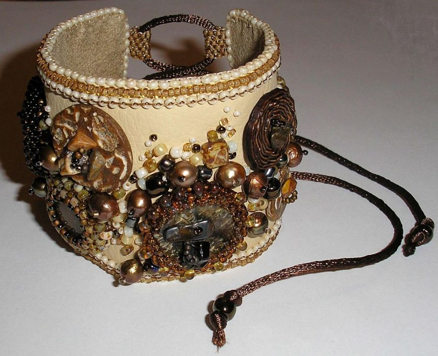 Okazała, zjawiskowa bransoleta ręcznie zrobiona od podstaw - bardzo staranna i solidna praca, efekt wielu dni pracy. Na beżowej ekoskórce wyszyta kompozycja z pereł słodkowodnych, koralików toho, Tile, Preciosa, guzików i minerałów. Niektóre guziki zostały oplecione koralikami. Tył podszyty beżowym sztucznym zamszem (Super Suede). Sznurowana jak gorset, dzięki czemu dopasowuje się do każdego nadgarstka i na każdym będzie wyglądać doskonale, idealna dla osób uczulonych na metale (brak jakiegokolwiek metalu przy zapięciu).