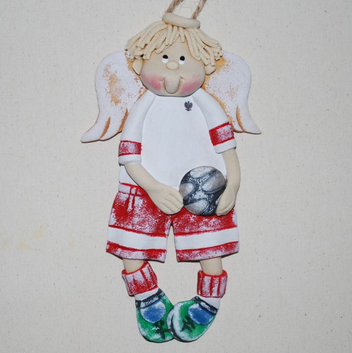 Aniołek w stroju sportowym, wykonany z masy solnej, termicznie utwardzany, malowany, z tyłu zabezpieczony lakierem i zapakowany ozdobnie w woreczek z celofanu. Na życzenie klienta istnieje możliwość wpisania imienia zawodnika na jego koszulce - gratis. Wielkość, bez zawieszki (sznurek konopny),ok. 19-22cm. Zapraszam