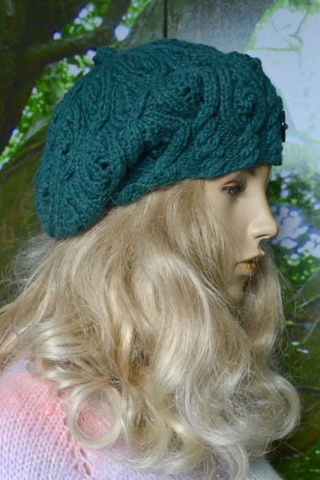 Beret został wykonany ręcznie na drutach z włóczki akrylowej z domieszką wełny w kolorze butelkowej zieleni.
