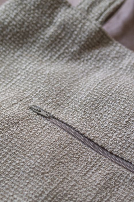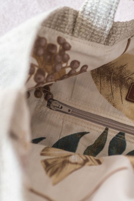 Torebka posiada bawełnianą podszewkę w kwiaty, a w środku kieszeń zapinaną na suwak. Z tyłu torby znajduje się dodatkowa kieszonka zapinana na suwak.