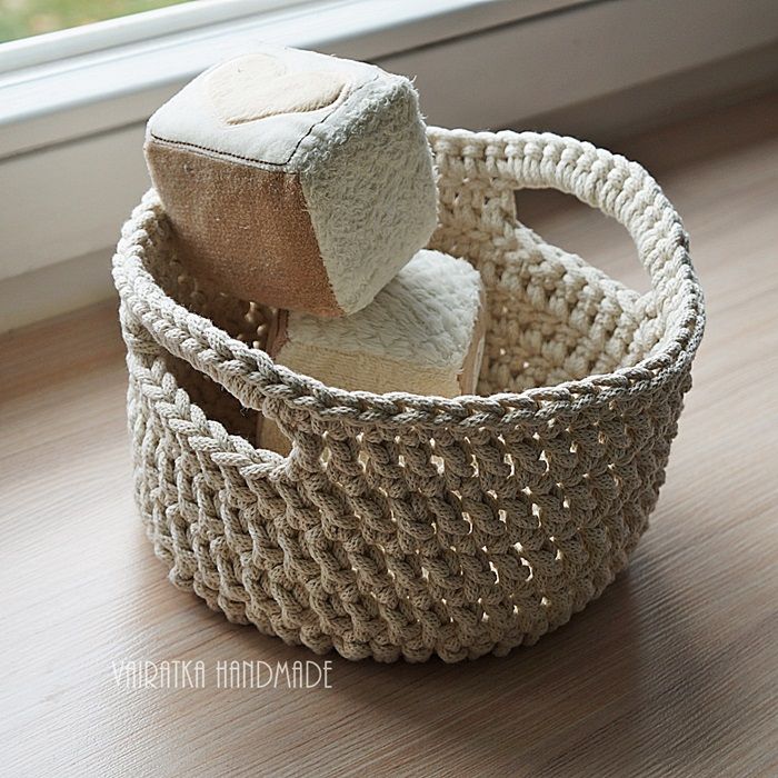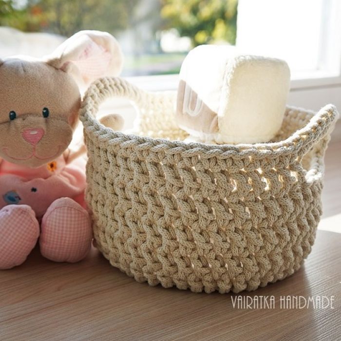 Okrągły koszyk z bawełnianego sznurka, wykonany na szydełku. Idealny do przechowywania przyborów łazienkowych lub drobiazgów w pokoju dziecięcym. Po bokach wygodne uchwyty.