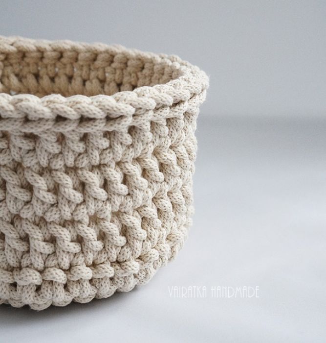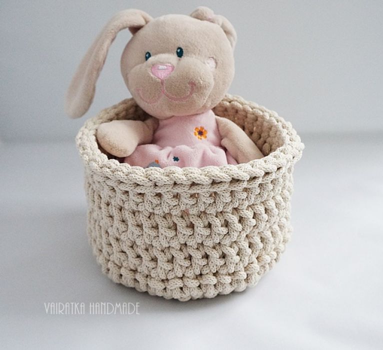 Okrągły koszyk z bawełnianego sznurka, wykonany na szydełku. Idealny do przechowywania przyborów łazienkowych lub drobiazgów w pokoju dziecięcym.