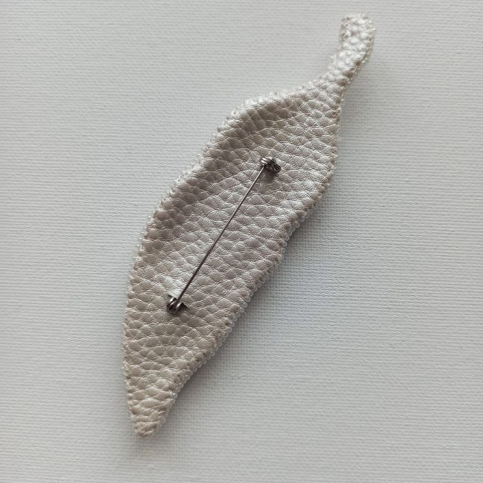 Tył: srebrna sztuczna skóra z bezpiecznym zapięciem na szpilkę.