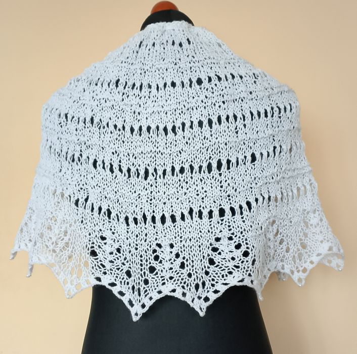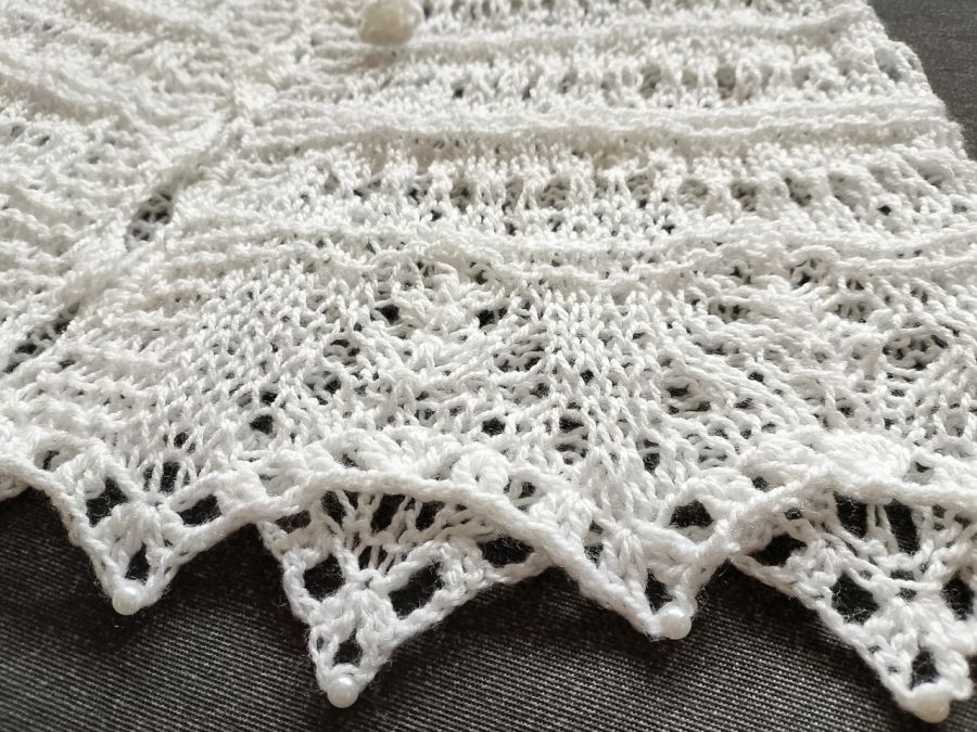 Biała komunijna pelerynka wykonana w całości ręcznie na drutach z przyjemnej w dotyku włóczki akrylowej. Zakończona koronkowym wzorem, oraz perłowymi koralikami. Wiązana wokół szyi ozdobnym sznureczkiem z szydełkowymi kwiatkami na końcach. Wiązanie umożliwia regulację obwodu.
