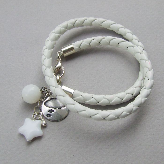 Podwójna bransoletka z grubego, plecionego białego rzemienia z muszlą (koral białej muszli i gwiazdka ze szkła). Do tego bardzo ładna dwustronna zawieszka DREAM. Na nadgarstek od 15 cm do 19 cm.