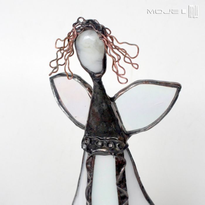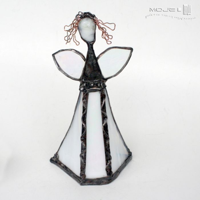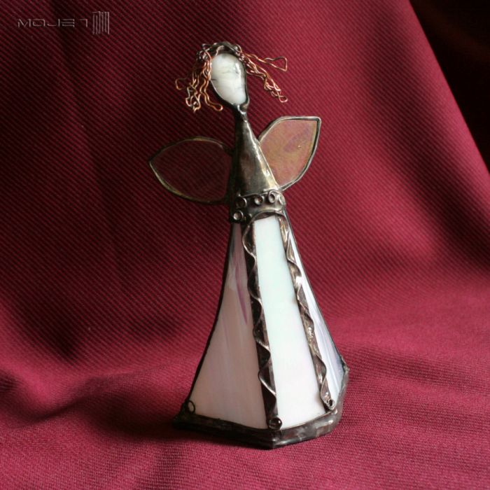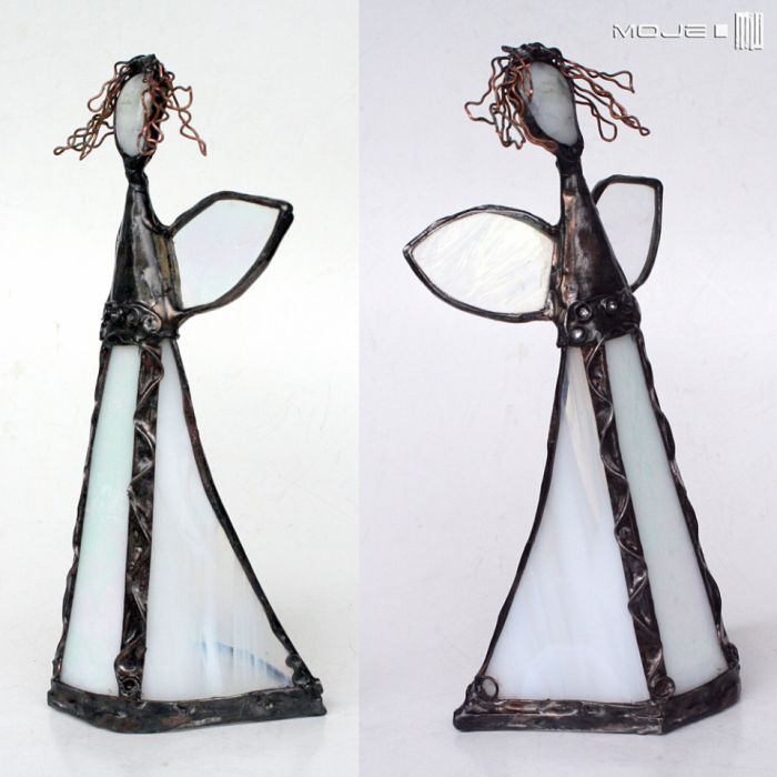 Szklany stojący, klimatyczny anioł ze szkła witrażowego - białego półgęstego i białego z opalizującą tęczowo powłoką. Oprawiony witrażową techniką Tiffany z użyciem miedzi i cyny - patynowany i przecierany. Jego główkę zrobiłam metodą fusingu (wypalanie szkła w temp. min. 800 stopni). Skrzydła są z przejrzystego iryzującego szkła. Podstawka z bezbarwnego szkła.