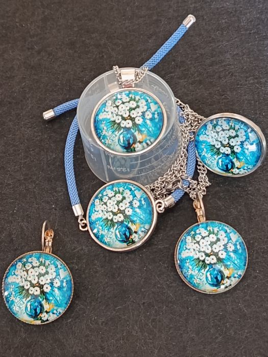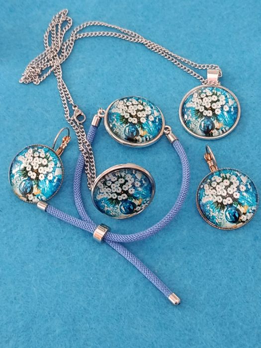 Kwiatowy komplet biżuterii w kolorystyce biało niebieskiej. Powstał z użyciem szklanych kaboszonów o średnicy 25 mm. Oprawa i łańcuszek ( 60 cm) w kolorze srebrnym. W skład kompletu wchodzi: naszyjnik, kolczyki, regulowany pierścionek i bransoletka na niebieskim sznureczku.