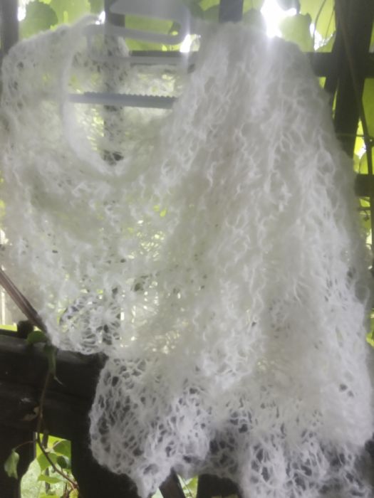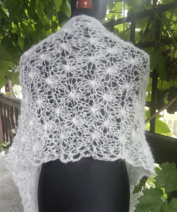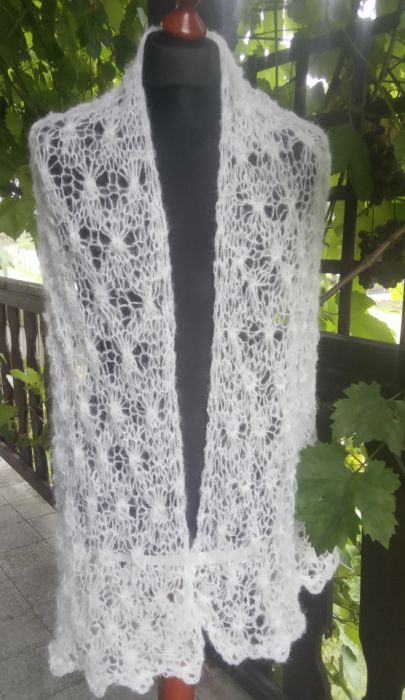Biały elegancki szal w całości wykonany ręcznie na drutach pięknym wzorem. Jest bardzo delikatny, leciutki i puszysty. Będzie doskonałym dodatkiem ślubnym, wieczorowym lub codziennym. Ozdobi każdą stylizację. Jest plastyczny i rozciągliwy, więc można nosić go na różne sposoby.