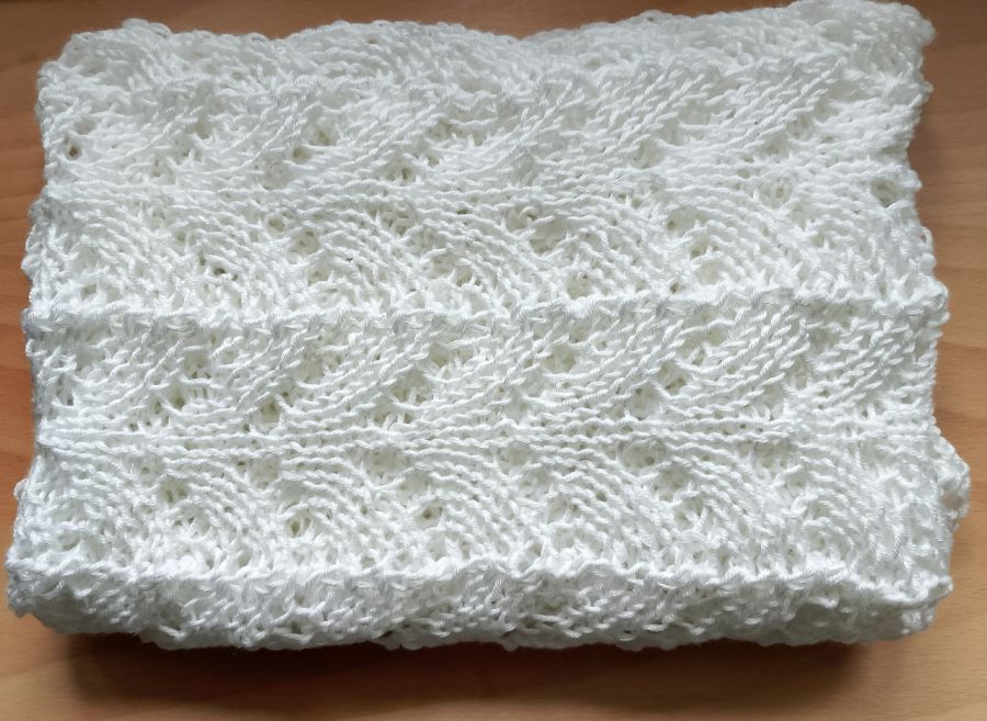 Biały elegancki szal w całości wykonany ręcznie na drutach pięknym wzorem. Szal jest niezwyklej jakości, delikatny w dotyku, o perłowym połysku, przelewający się przez palce i jedwabiście gładki.