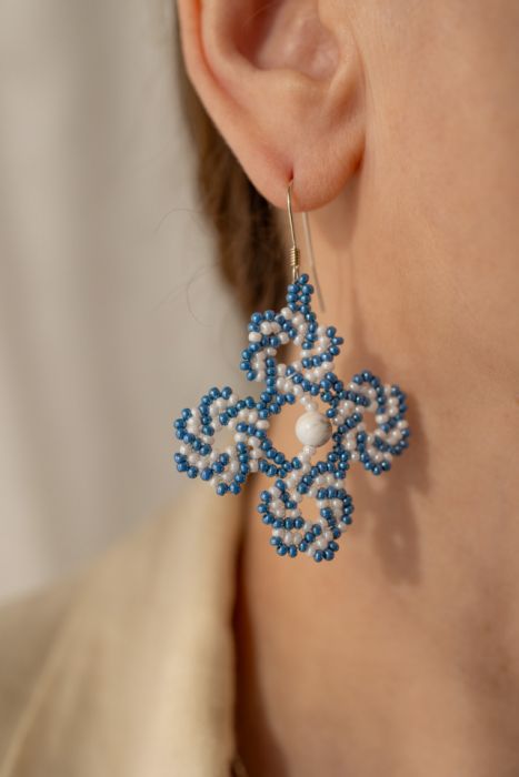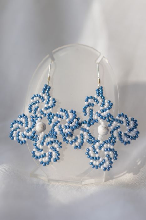 Ręcznie wykonane kolczyki z drobnych czeskich koralików szklanych w kolorze niebieskim i białym, ułożonych w symetryczny, ażurowy wzór przypominający kwiaty. W centralnej części każdego kolczyka znajduje się kulka howlitu w odcieniu białym z charakterystycznym, szarym użyleniem. Lekkie, subtelnie kołyszą się podczas noszenia. Sprawdzą się zarówno na co dzień, jak i na specjalne okazje, a także jako prezent. Kolczyki posiadają srebrne bigle, a w zestawie znajdują się silikonowe baranki zapewniające komfort i bezpieczeństwo noszenia.