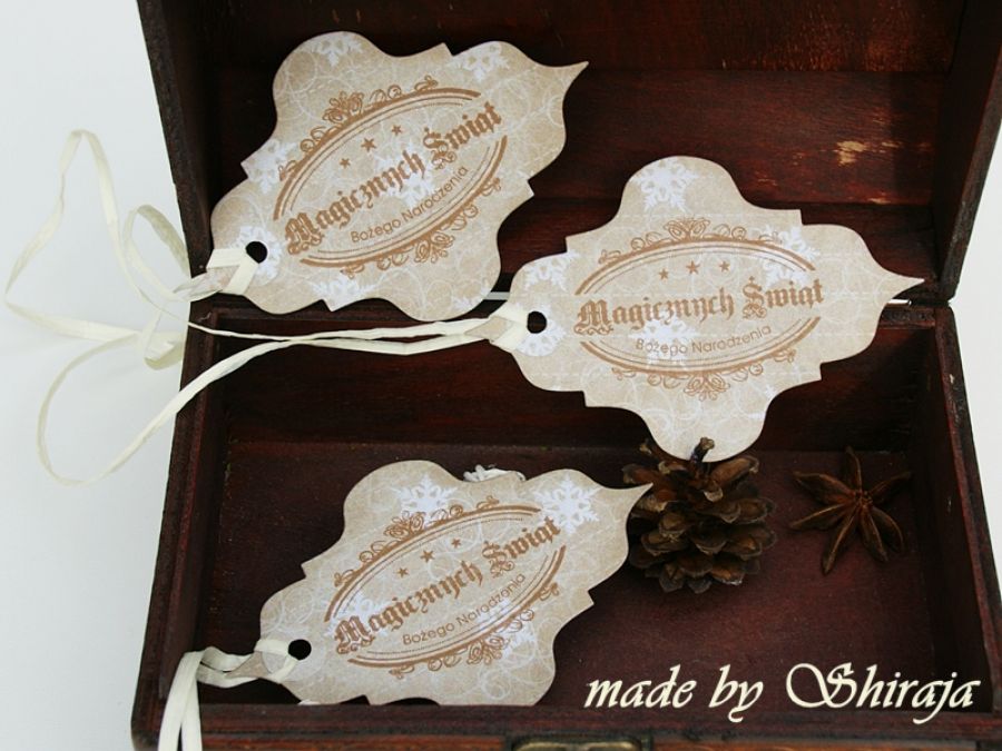 Wyjątkowy komplet 3 szt. zawieszek do prezentów, wykonany własnoręcznie. Ozdobiony rafią stylowym napisem Magicznych Świąt, brzegi przetarte połyskującym tuszem. Niebanalny sposób na udekorowanie świątecznych podarunków :)