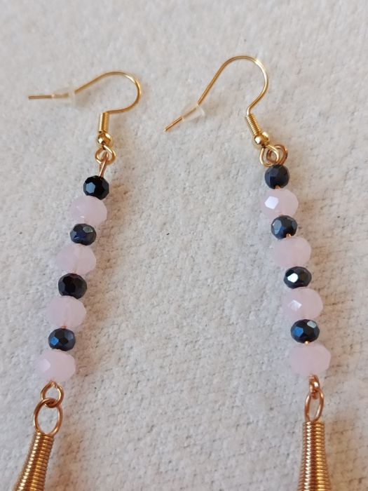 Zwiewne, romantyczne i lekkie kolczyki wykonane z płatków szyfonowych. Ozdobione naprzemiennie 4 bladoróżowymi koralikami - oponkami oraz 4 małymi granatowymi kryształkami, dla ożywienia całości. Bigle otwarte wykonane są ze stali szlachetnej, nie uczulają. Całkowita długość kolczyka to 12 cm. Na życzenie Klientki mogę skrócić, wymienić koraliki. Serdecznie polecam