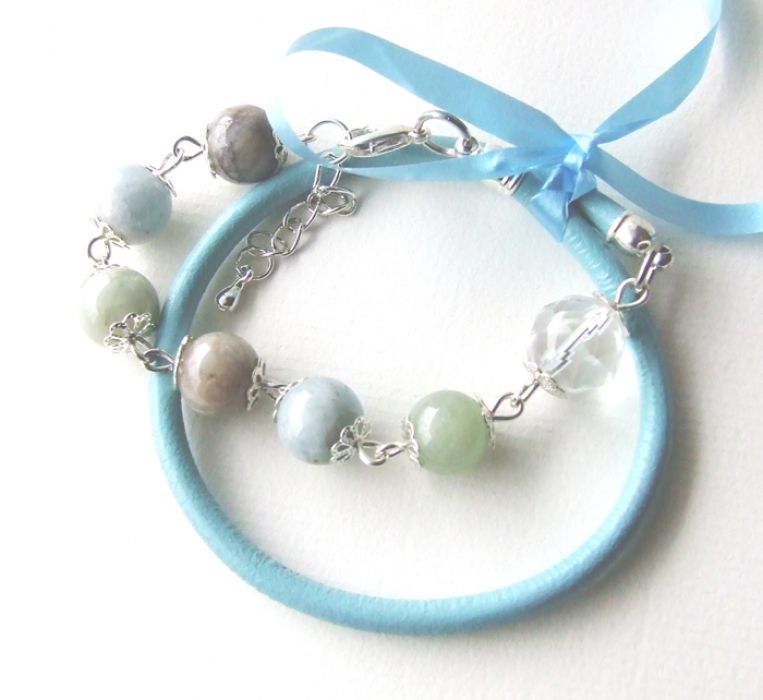 Wykonana z naturalnej skóry (rzemień błękitny o grubości 3 mm), przepięknych kamieni w odcieniach błękitu i błękitu przełamanego szarością i zielenią, z regulacja obwodu. Dwukrotnie owijana wokół nadgarstka.