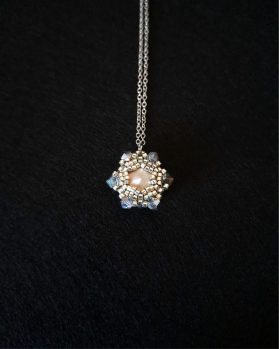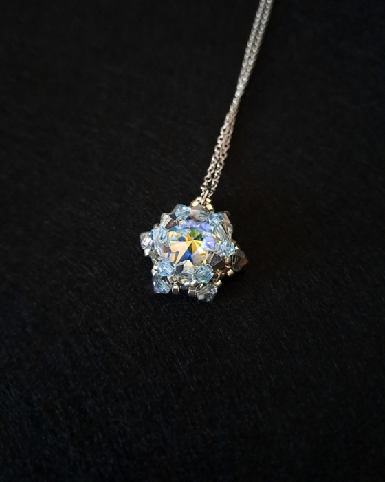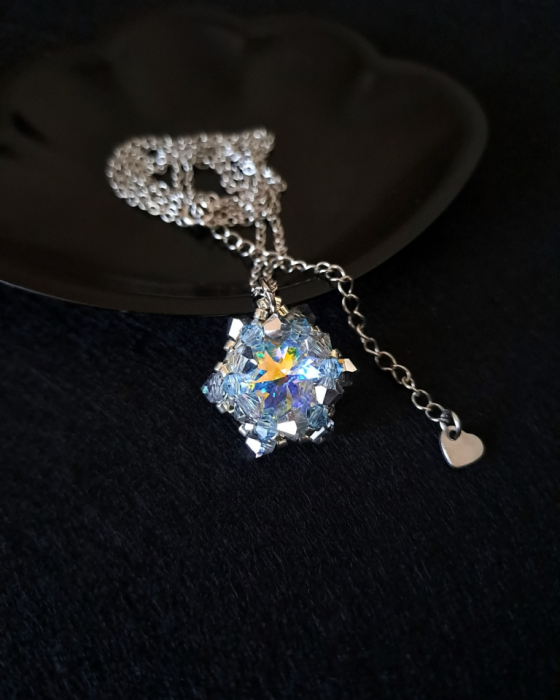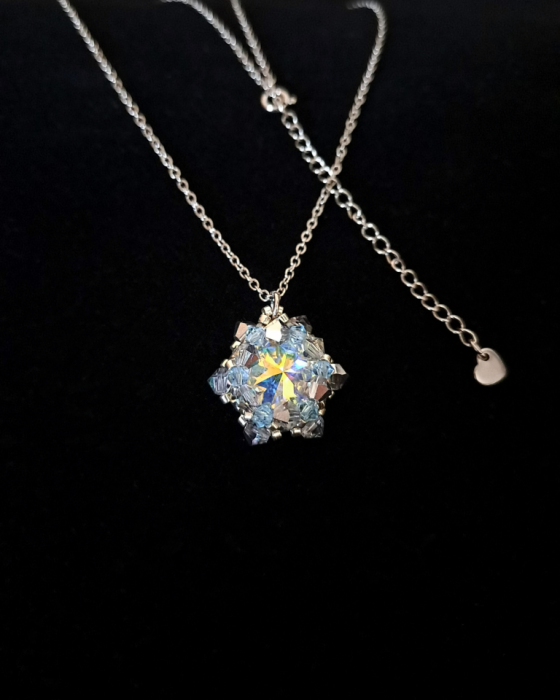Centralny punkt naszyjnika stanowi kamień Preciosa Rivoli Maxima w kolorze Crystal AB - hipnotyzujący blaskiem i lekkością. Towarzyszą mu kryształki Preciosa Bicone w barwach Aqua Bohemica i Crystal Vitrail Light, dopełnione srebrzystymi koralikami Miyuki Delica. Wszystko zamknięte w formie zawieszki o wymiarach 2,1 × 2,1 cm, zawieszonej na klasycznym łańcuszku ankier ze stali nierdzewnej (45 cm 5 cm przedłużka).
