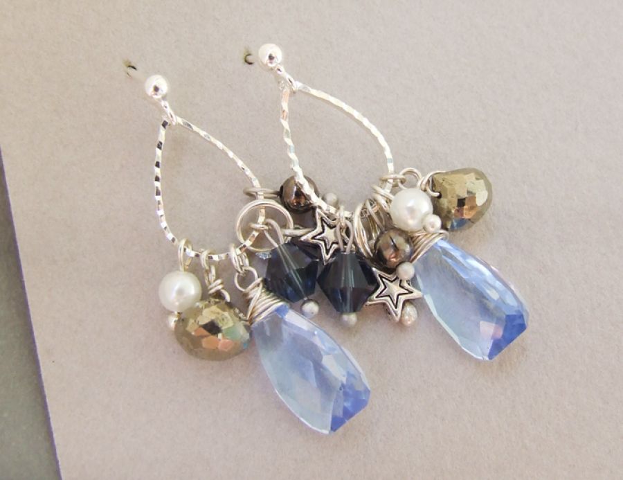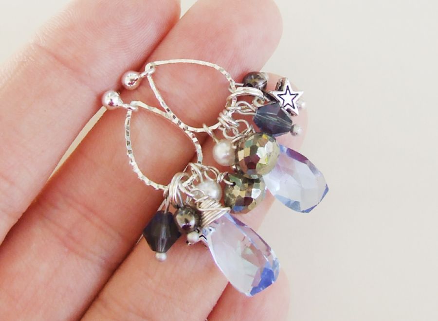 Kolczyki bardzo bogate, ozdobne. Wykonane ze srebrnej, antyalergicznej bazy, naturalnego pirytu wysokiej klasy, kryształów Swarovskiego, doskonałej jakości błękitnych cyronii, sztyftów-kuleczek ze srebra 925, drucików i ogniw ze srebra 925. Dodatkiem jest gwiazdka w srebrnym kolorze, perełki i oksydowane kuleczki, a także drucik pokryty srebrem..