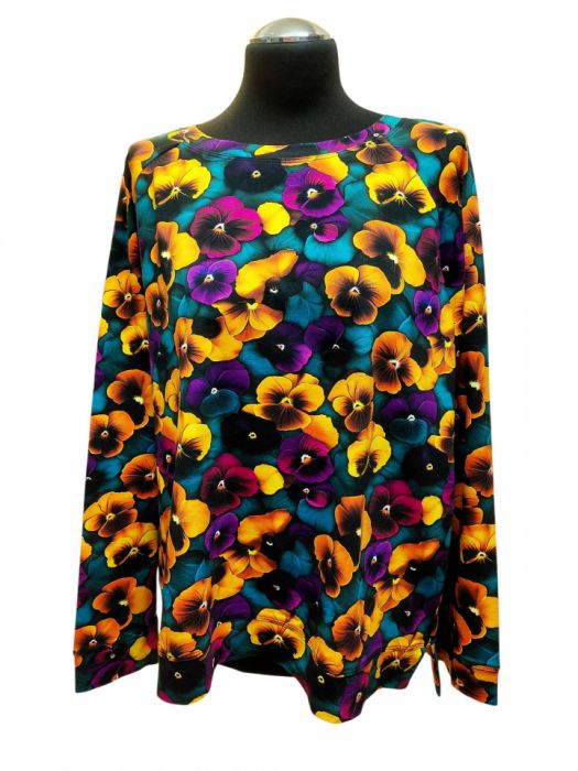 Bluzka damska uszyta z dzianiny jersey, wzór cyfrowy w kolorowe bratki, ozdobne rozporki na bokach.