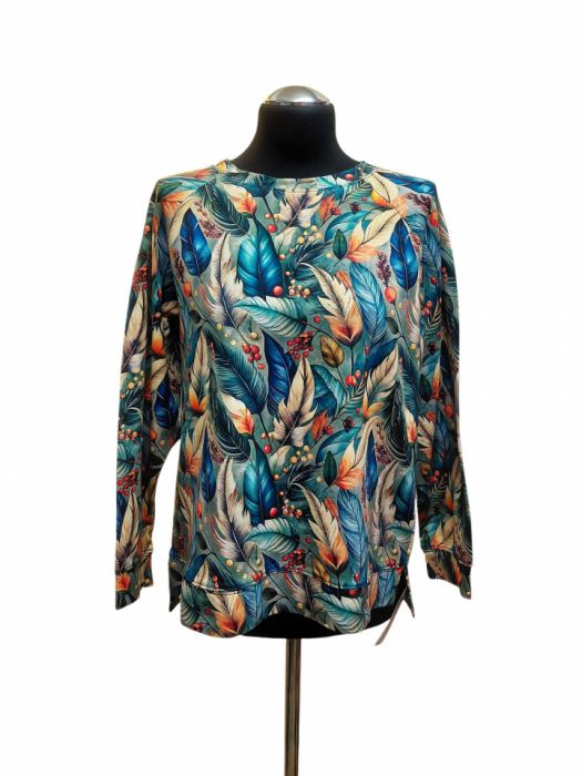 Bluzka damska uszyta z dresówki pętelki, przekładana przez głowę, wzór cyfrowy, ozdobne rozporki na bokach.