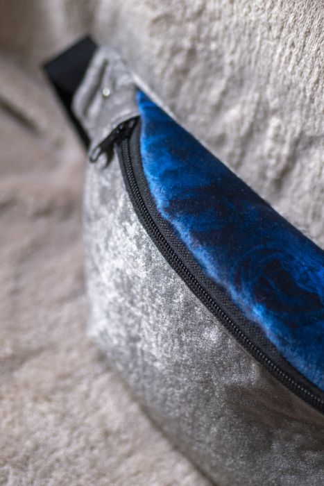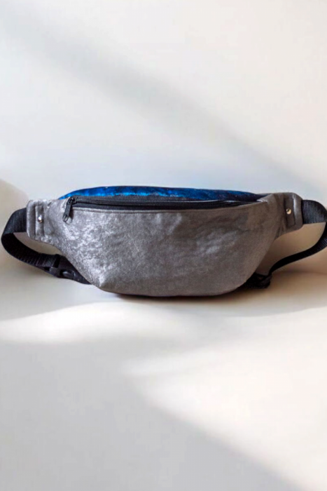 Duża nerka saszetka biodrowa w kolorze szarym wykonana z połyskującej tkaniny. Klapa z granatowego weluru w róże.