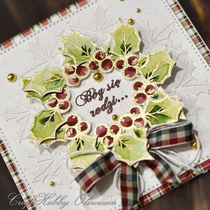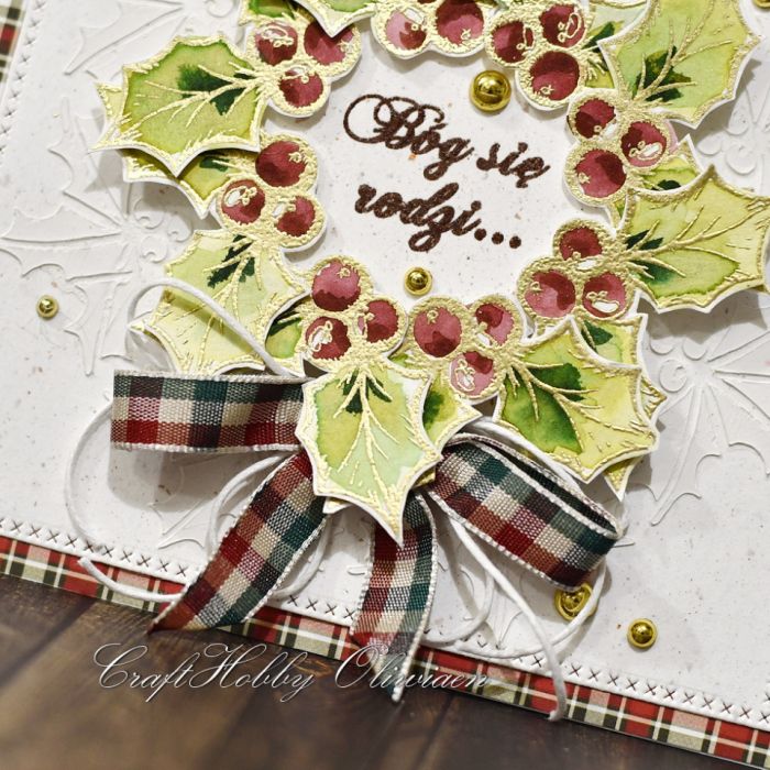 Wyjątkowa, oryginalna kartka świąteczna z okazji Bożego Narodzenia. Wykonana z bezkwasowych papierów do scrapbookingu, ozdobiona tłem ze wzorem wianka ostrokrzewu naniesionego pastą strukturalną oraz tuszowanym, embossowanym i ręcznie kolorowanym wiankiem ostrokrzewu, stemplowanym i embossowanym napisem, złotymi perełkami, wstążką w krateczkę i sznureczkiem. Całość pięknie mieni się i skrzy pod światło.