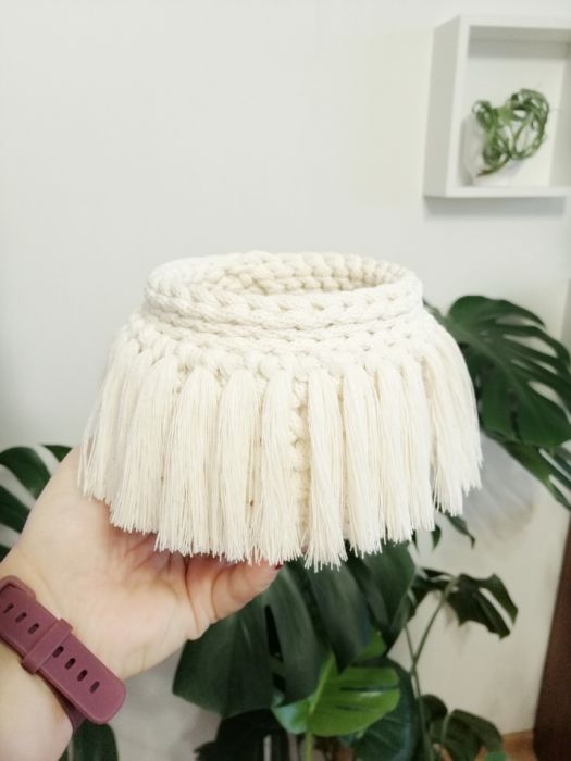 Duży kosz BOHO wykonany na szydełku z sznurka bawełnianego o średnicy 5mm z frędzlami...