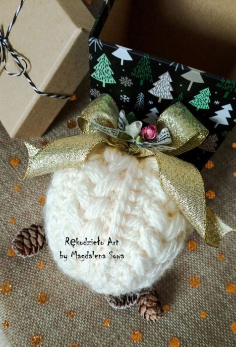 Śliczna bombka wykonana na styropianowej kuli o wielkości 8 cm z grubej wóczki (50% wełna, 50% akryl).