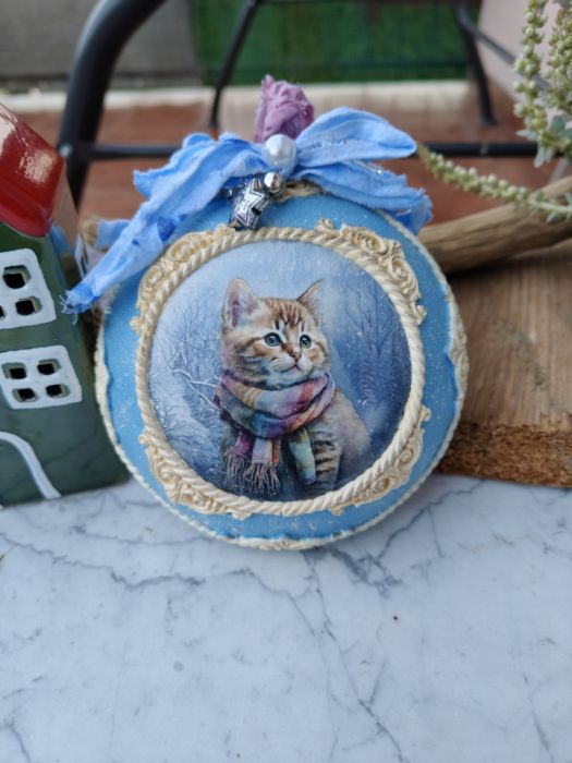 Nazwa produktu: Bombka świąteczna z kotem handmade vintage – ozdoba choinkowa ręcznie robiona