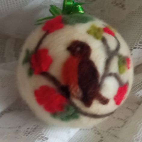Oryginalna bombka zdobiona HANDMADE metodą filcowania na sucho. Kanwą do filcowania była styropianowa kula. Motywem ozdobnym są ptaszki. Zaletą tego typu ozdób jest to, że są nietłukące. Doskonale sprawdzą się w domach gdzie są malutkie dzieci i zwierzęta. Bombka świetnie sprawdzi się na choince czy jako dekoracja okna, komody, stołu wigilijnego. Łatwo można zawiesić ozdobę gdzie tylko chcemy.