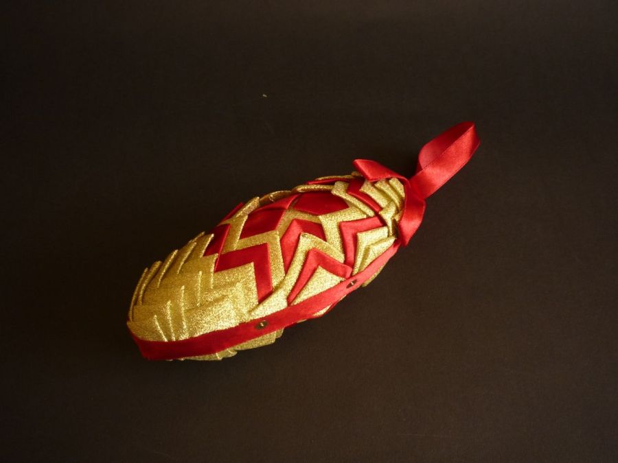 Bombka dwustronna - szyszka, zdobiona metodą wstążeczkową. Wysokość ok. 15cm, obwód ok 12 cm. Bombkę można powiesić na choince, w oknie, na stojaku, upiąć w stroiku. Doskonały pomysł na prezent.