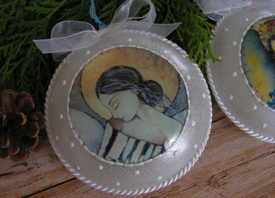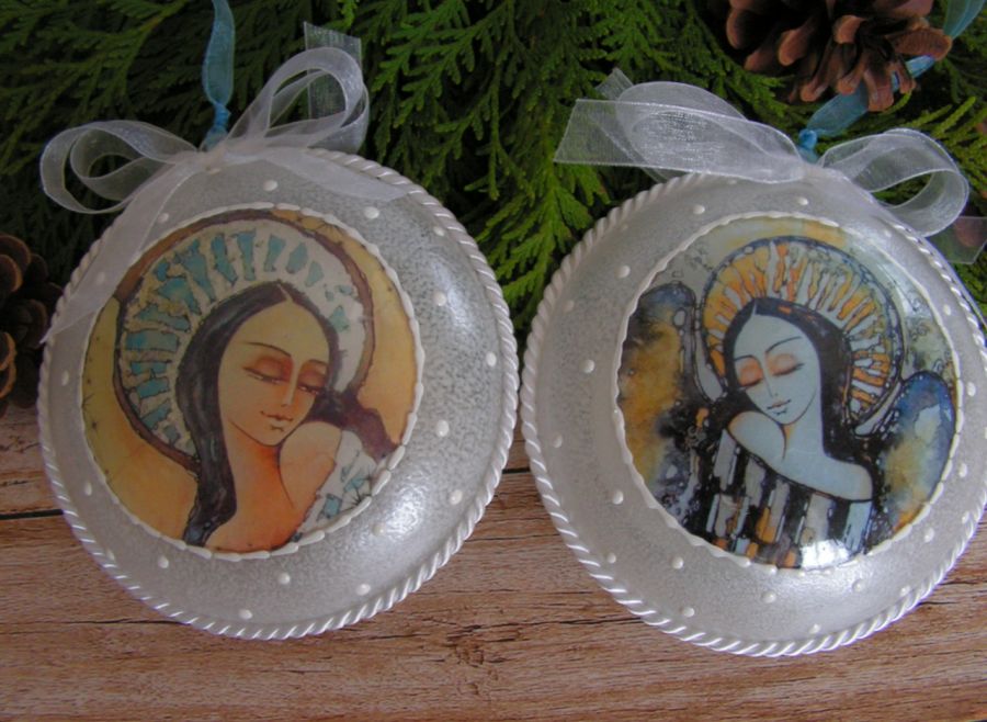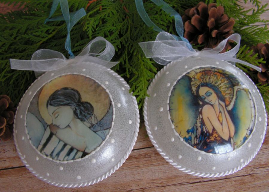 Dwa akrylowe medaliony na choinkę z wizerunkami Aniołów. Medaliony są dwustronnie zdobione techniką decoupage.