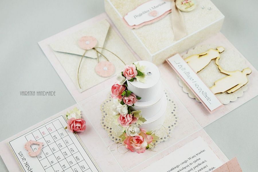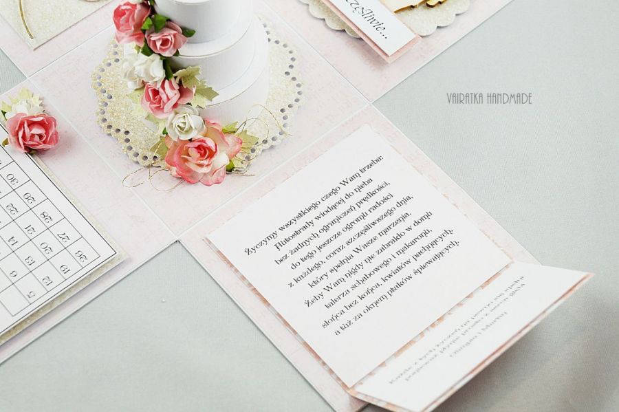 Na ściankach ozdobne motywy, cytat, kieszonka na prezent pieniężny i miejsce na życzenia (do samodzielnego wpisania lub wydrukowane - proszę o wcześniejszy kontakt.