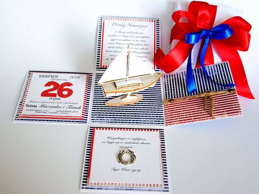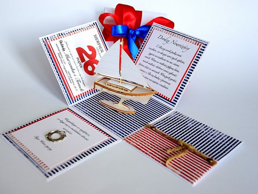 Ślubny exploding box jest idealnym rozwiązaniem gdy chcemy Młodej Parze ofiarować w prezencie pieniążki. Pudełeczko to daje taką właśnie możliwość a jednocześnie stanowi doskonałą pamiątkę z tego najpiękniejszego dnia w życiu. W centralnej części znajduje się stateczek - idealny box na marynarski ślub;). Pudełeczko jest wykonane bardzo starannie z dbałością o każdy szczegół i będzie stanowiło wspaniała pamiątkę. Gorąco polecam!